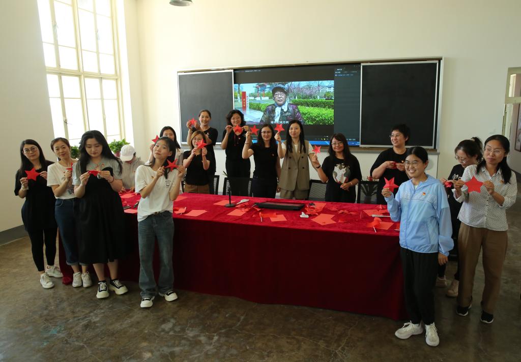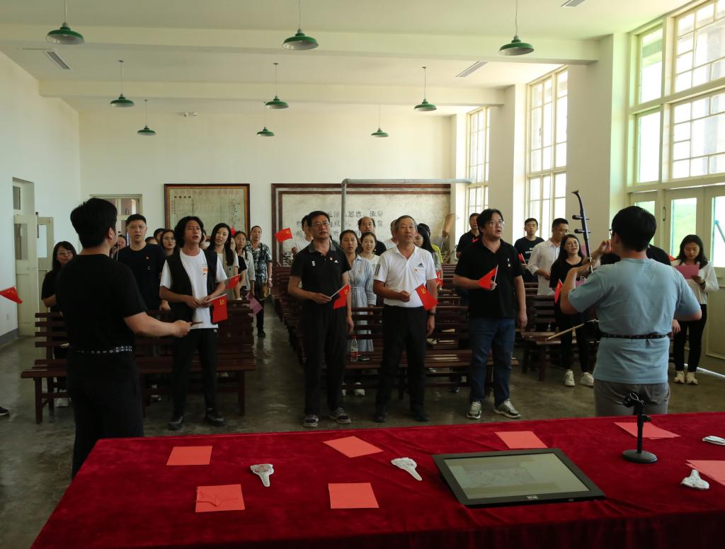 首先所有党员老师在广场入党誓词墙前庄严宣誓,重温入党誓词。铿锵有力的宣誓声,让每位党员老师牢记“不忘初心,砥砺前行”,进一步坚定了共产党员的理想信念,并用实际行动践行入党誓言。在教育基地二楼的老会议室,马茂询、王膺涵、田潇戈三位老师用二胡和手风琴伴奏,全体参加活动的老师齐唱歌曲《我的祖国》,每个人都激动的挥舞着手中的党旗,将活动推向高潮。最后,全体女教师党员用红纸剪出一个个红五星,以此做为庆祝建党101周年的告白。
