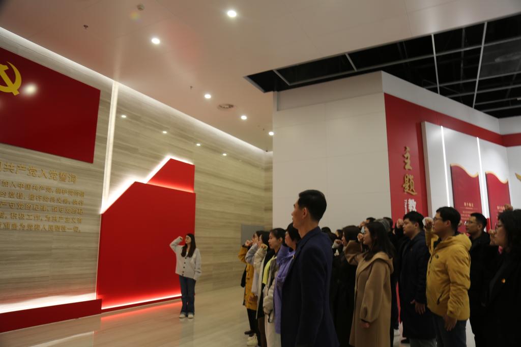 秦皇岛博物馆收藏展示了丰富的物质文化遗产,记录了城市历史发展的重要历程,全景式展现我市独特魅力。在讲解员的引导下,教师党员们参观了“山海文明”“古国故事”“沧海碣石”“金戈古道”“多元并蓄”“长城重镇”“百年风云”七大展区内容,以重要历史节点、重要历史人物和珍贵文物为依托,凝练和凸显了不同历史时期秦皇岛独有的地域文化和城市精神。在红色主题教育展区,全体党员面对鲜红的党旗,怀着无比崇敬的心情,重温入党誓词,一句句坚定响亮的声音在展馆里响起......