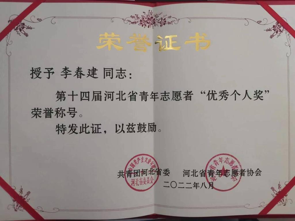 BEATS李春建同学荣获河北省青年志愿者“优秀个人奖”荣誉称号