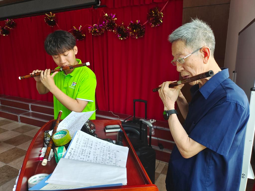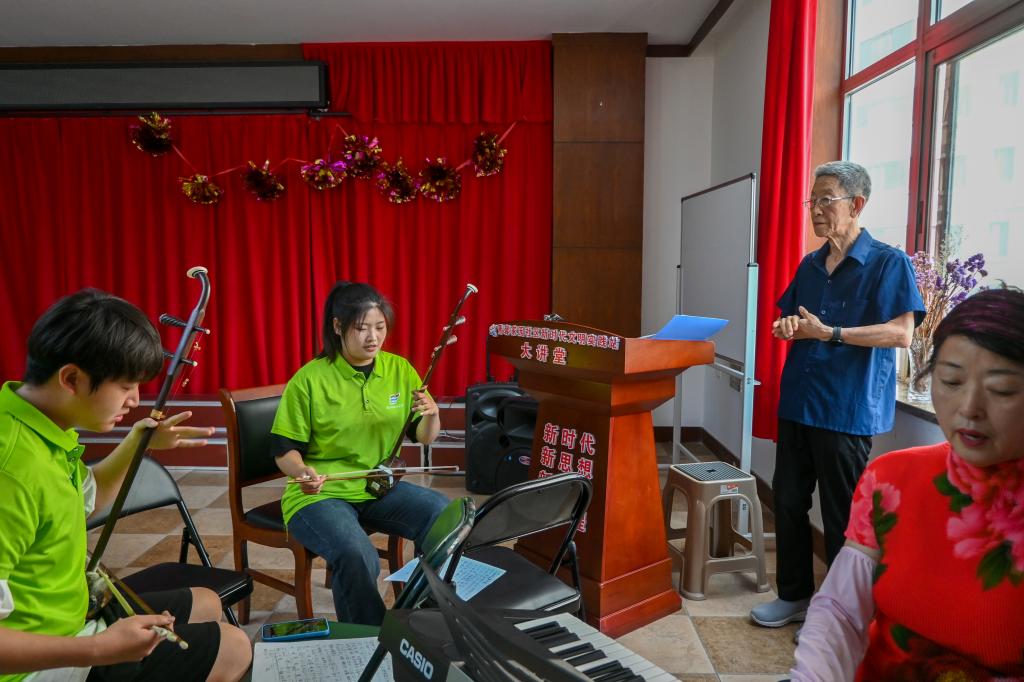 实践队员们充分发挥音乐学、舞蹈表演等专业特长,与社区的“馨悦合唱团”、舞蹈团积极互动。活动室内,实践队员为合唱团的爷爷奶奶们讲解声乐发声方式和演唱技巧,为舞蹈团的阿姨们做技巧示范;小广场上,队员们与老人们一起合唱,一起朗诵,还为合唱活动进行器乐伴奏,与老人交流笛子演奏的技法和心得。经过几天的相处,双方的了解和默契逐步提升,共同感受文艺带来的快乐。