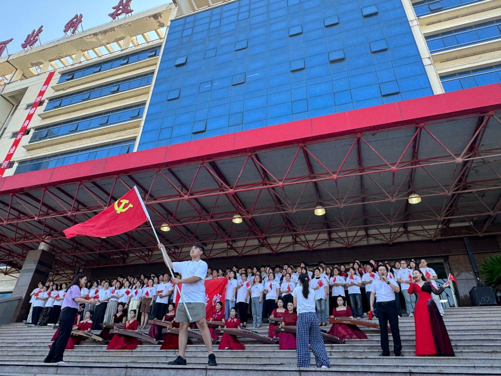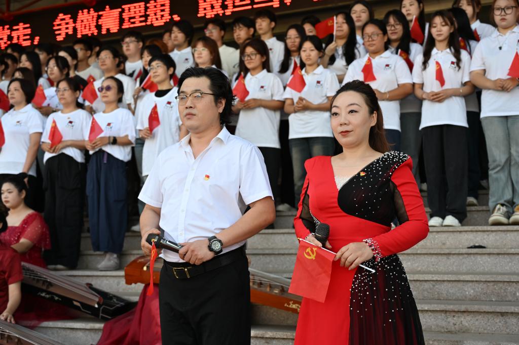 "一条大河波浪宽,风吹稻花香两岸。这唱的是我们伟大、光荣、英雄的中国人民对家乡、对祖国最深沉的眷恋。"在主持人的引领下,全场师生共同发出时代最强音,高声呼喊:"伟大、光荣、正确的中国共产党万岁!伟大、光荣、英雄的中国人民万岁!"